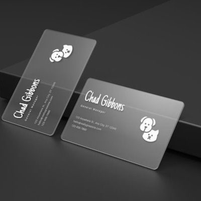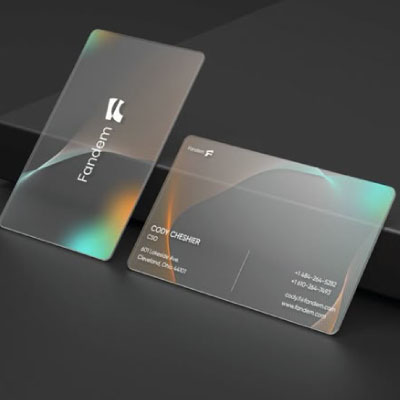 این کارت ها از جنس پلاستیک شفاف معمولاً PVC یا پلی کربنات ساخته میشوند و واقعاً شفاف و شیشهای هستند. این نوع کارتها معمولاً گرانتر هستند اما ظاهر بسیار شیک و مدرنی دارند.