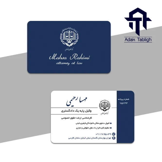 برای دانلود کارت ویزیت وکالت طرح مهسا رحیمی، کافی است پس از پرداخت مبلغ تعیینشده، فایل لایهباز این طرح شیک و پریمیوم را بهصورت فشرده و با حجم کم دریافت کنید. فروشگاه اینترنتی آداک تبلیغ با ارائه طرحهای آماده و قابل ویرایش، همراه مطمئن شما در انتخاب بهترین طراحی کارت ویزیت متناسب با حرفه حقوقیتان است.